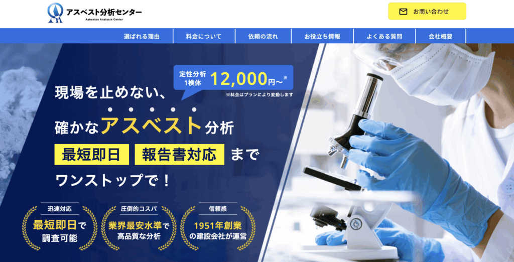 愛媛県西条市に本社を構える株式会社青野組は、1951年創業の建設会社が母体となり立ち上げた専門分析部門「アスベスト分析センター」を運営しています。建築・土木・解体工事のノウハウを活かし、最短即日でのスピード報告や低価格設定を実現しているのが特徴です。JIS A1481 規格に準拠した偏光顕微鏡による分析を提供し、自社完結だからこそ実現できる明朗な料金体系も強みです。全国から検体を受け付け、法人・公共機関向けに一貫した調査~報告~届出対応まで幅広くサポートしています。
