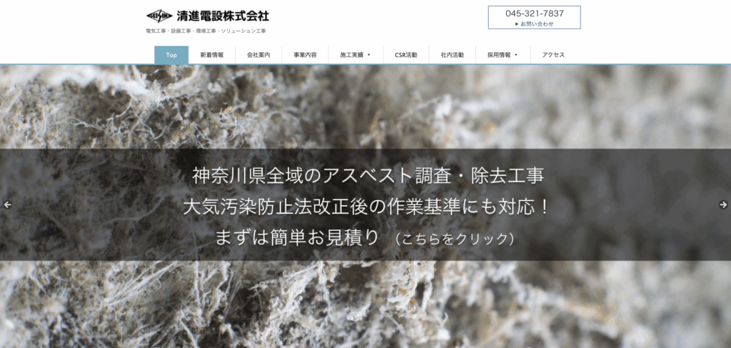 清進電設株式会社は、神奈川県横浜市に本社を構え、電気・設備・環境に関する工事とソリューションを提供する総合建設企業です。「解体・環境」分野ではアスベストの調査と除去にも特化しており、公共工事・民間工事を問わず、戸建て住宅から中大規模施設まで幅広く対応しています。東京都・神奈川県・茨城県に渡って営業所が設置され、アスベスト調査専用窓口も設置されているため、迅速な対応が可能です。