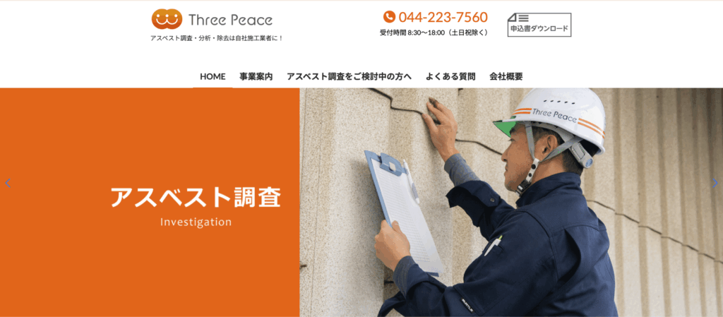 株式会社ThreePeace(スリーピース)は、神奈川県川崎市に拠点を置き、関東県を対象にアスベスト調査・除去・処理を自社施工で一貫して提供している企業です。建築物石綿含有建材調査者の資格を持った調査員が多数在籍している他、アスベスト関連機器類についても、多様な機材を取り揃えており、調査から廃棄処分までをスピーディかつ法令順守で実施します。電子報告義務化後も業務メニューを拡充し、少量案件や緊急調査にも柔軟に対応しています。