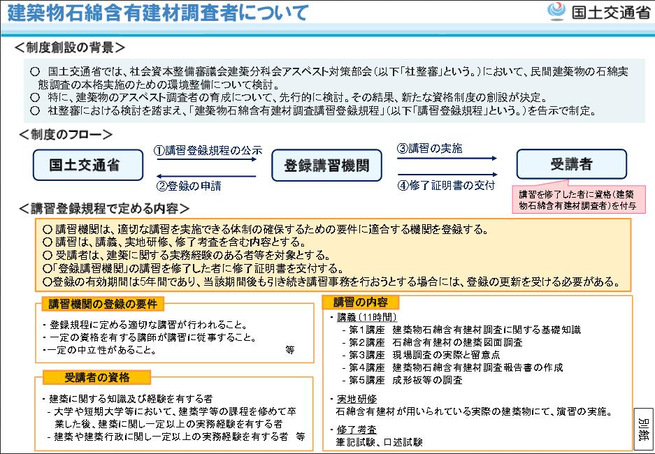 [1] 厚生労働省 石綿総合情報ポータルサイト. 「建築物石綿含有建材調査者講習」.