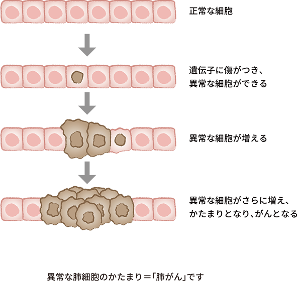 正常な肺の細胞は、整然と並んでいますが、タバコの煙に長期間さらされると、細胞の遺伝子に異常が生じ、無秩序に増殖を始める「がん細胞」へと変化します。このがん細胞のかたまりが、肺がんです。喫煙を始めた年齢が若く、喫煙量が多いほど、肺がんになるリスクは高まります。
