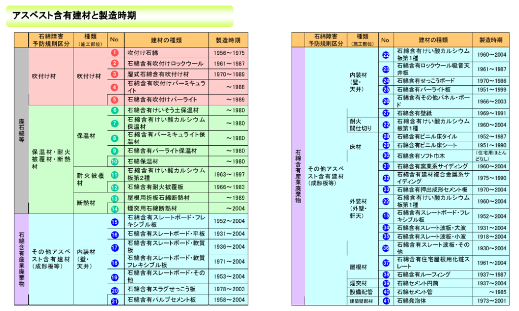 ・ 該当建材:アスベスト含有保温材、断熱材、耐火被覆板(一部)など。