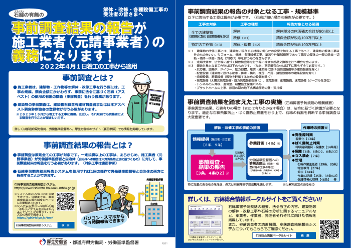・ 事前調査結果の報告: 一定規模以上の解体等工事を行う場合、元請業者はアスベスト事前調査の結果を都道府県等に報告することが義務付けられました。