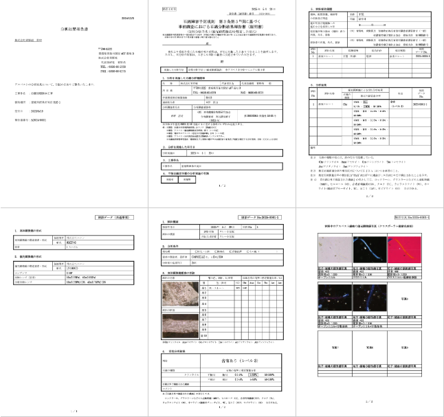 アスベストに関する調査や届出を怠ると、大気汚染防止法や労働安全衛生法に違反し、罰金や行政処分につながる重大なリスクがあるため、青野組が提供する分析報告書は「そのまま提出できる品質」を前提に設計されています。報告書は、様式第5号などの法定提出用に完全に準拠しており、依頼者側で再整理や再作成の手間が必要ありません。また、報告書は検体ごとに写真が添付され、1ページ構成のPDF形式で提供されるため、提出・保存・共有が非常にスムーズに行えます。これにより、工事前の行政への届出書類として使用する際に、安心して利用することが可能です。また、初めてアスベスト調査を依頼するお客様に対しても、提出しやすい報告書フォーマットや事前ガイドを提供することで、「はじめてでも迷わない」依頼設計を実現しています。