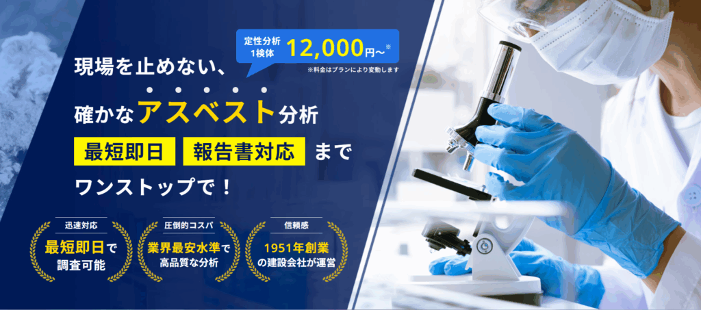 株式会社青野組は、1951年創業に愛媛県で創業された歴史を持つ建設会社であり、長年にわたり培ってきた土木・建築・解体事業に関する深い現場経験と知見を活かし、アスベスト分析センターの運営を担っています。本社は愛媛県西条市にあり、現場の工程を熟知した体制で、最短即日納品可能な迅速なアスベスト分析サービスを全国対応で提供しています。「現場を止めない」スピード対応を最優先としつつ、分析をすべて自社で完結させることで中間コストを削減し、1検体12,000円(税抜)〜という業界最安水準の価格設計を実現しています。また、初めて依頼するお客様でも迷わないよう、フォーム入力と検体送付だけで依頼が完了するシンプルな設計と、提出しやすい報告書フォーマットを提供しており、品質を落とさずに費用対効果の高いサービスを提供し続けています。