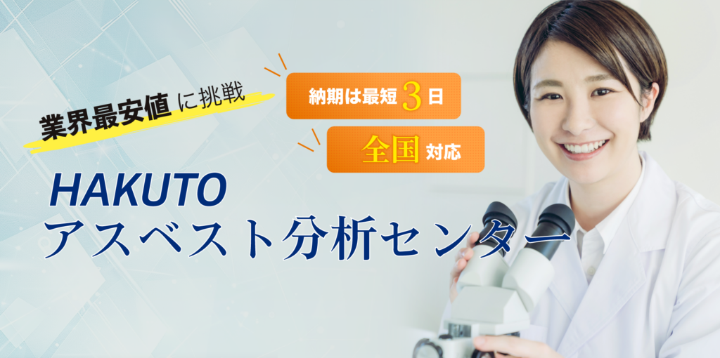 株式会社ハクトーが運営するHAKUTOアスベスト分析センターは、低価格かつ迅速な対応を強みとする、アスベスト分析を専門に行う機関です。お客様自身で採取した検体の分析に特化することで、1検体12,000円(税別)からの業界最安値水準と、最短3日で報告書を発送するスピード対応を実現しています。特に午前中に検体が到着すれば当日を1営業日目として起算する迅速さは、工期短縮を求めるお客様から好評です。昭和59年創業の歴史を持ち、「石綿分析技術評価事業認定事業者(JIS A 1481-1)」として確かな技術力を有しているため、精度の高い分析が可能です。これまで報告書が行政に受理されなかった事例はなく、信頼性も万全です。所在地は石川県金沢市で、郵送により北海道から沖縄まで全国の現場に対応しています。